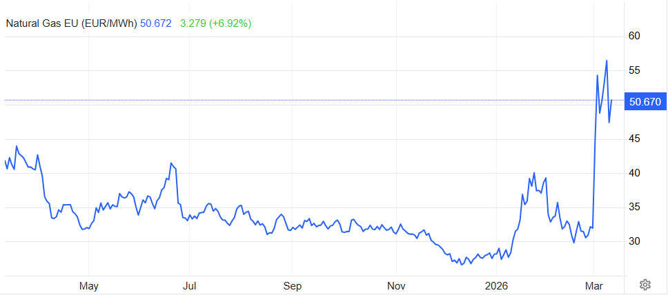 Wat zijn de financiële en economische gevolgen eigenlijk van de oorlog tegen Iran, die bijna zijn derde week in gaat? Inmiddels is iedereen wel expert als het over de Straat van Hormuz gaat, dus wat dat is hoeven we verder niet uit te leggen. Iran heeft de mogelijkheid om schepen aan te vallen die door de nauwe doorgang varen, waardoor zo ongeveer elke reder nu onverzekerd is; dreigen is al genoeg. Het scheepsverkeer in de regio is zo goed als stilgevallen. Daardoor kunnen de andere Golfstaten geen olie en gas maar ook kunstmest meer verkopen en dreigt er een nieuwe energiecrisis te ontstaan.