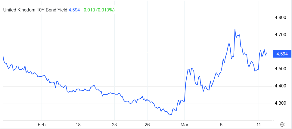 Om met die rentes te beginnen. De rente op tienjarige staatsleningen van het VK laat een duidelijke sprong zien, als de markten openen na het letterlijke startschot van de oorlog. Nu is de stijging wel een beetje beperkt, om eerlijk te zijn. En rond negen maart lijkt de rente over de piek heen te zijn. Dat zou kunnen betekenen dat financiële markten verwachten dat de oorlog niet lang zal duren. Natuurlijk zitten daar toch de best ingevoerde mensen (buiten Trump en Netanyahu natuurlijk).
