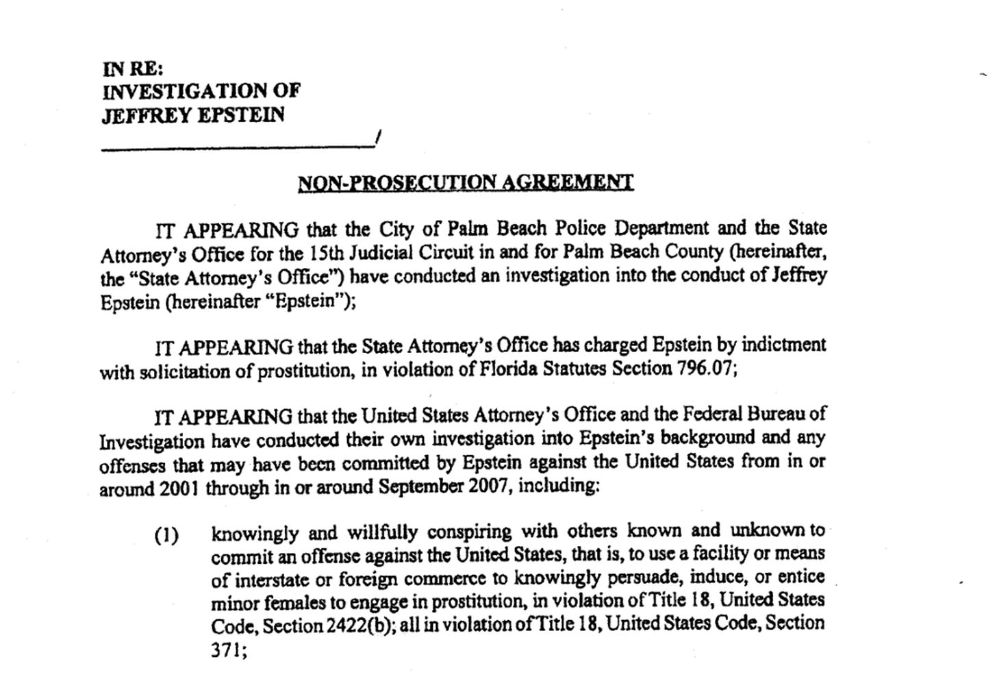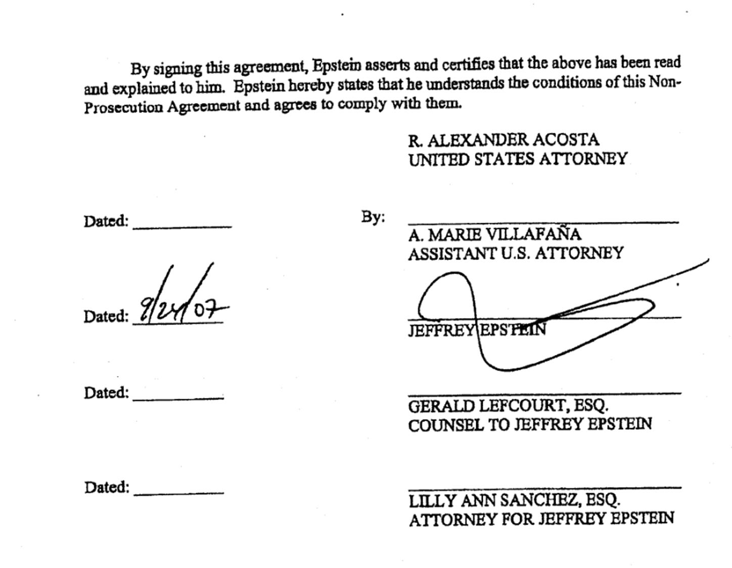 In die overeenkomst, zo heet dat ding, staat letterlijk dat er sprake is van misbruik en ‘overtredingen’. Epstein had een aantal meisjes van 14 en 15 gevonden om zich in eerste instantie te laten ‘masseren’. Dat ontaardde in verkrachting. Als onderdeel van de overeenkomst is opgenomen dat er na een korte gevangenisstraf van verdere vervolging geen sprake zou zijn. De datum van de overeenkomst: 24 september 2007.