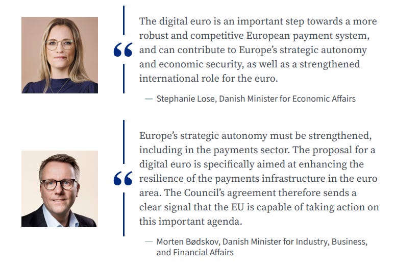 Op dit moment is Denemarken voorzitter van de EU. Dat betekent dat ze de vergaderingen voorzitten en de agenda bepalen. Deze situatie duurt nog een paar maanden, dus Denemarken heeft echt zijn best gedaan om dit nog te realiseren. Daarbij is het opvallend om te noemen dat Denemarken zelf geen euro heeft en de eigen burgers er geen last van gaan krijgen. De Deense centrale bank is ook tegen de digitale euro, omdat er al goede betaalmogelijkheden zijn. De Deense regering communiceerde evenwel redenen om toch door te gaan; de lezer mag ze zelf op waarde schatten.