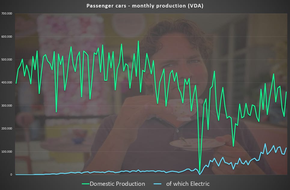 In het Duitse Verband der Automobilindustrie (VDA) heb je de beste vriend van je leven. Wie dat ontkent heeft nooit in een Duitse wagen over de snelwegen aldaar mogen scheuren. Gemiddeld produceren de Duitsers zo’n 450 duizend wagens per maand en daarmee nemen ze een groot deel van de export van Duitsland - en daarmee de eurozone - voor hun rekening. Tenminste, dat aantal werd ooit gehaald. Bij de pandemie daalde de productie in een specifieke maand inderdaad naar nul, om daarna weer op te veren. Vanwege de lockdown mochten Duitse werknemers toen niet naar hun mooie fabrieken, daar zouden ze een virus kunnen oplopen - dacht men toen. Vervelend verschijnsel: de huidige productie zit op 300 duizend per maand, een derde minder dan het oude niveau van voor de lockdown. De VDA publiceert de maandelijkse cijfers en inmiddels mag er toch echt wel van een zichtbare trend worden gesproken: zie de grafiek van de afgelopen tien jaar.