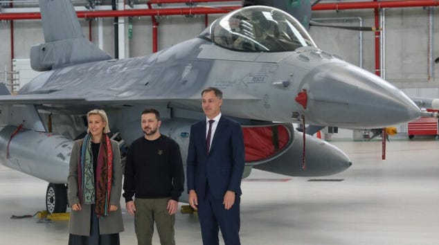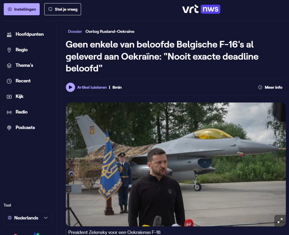 Voor haar Instagram-moment liet Dedonder Zelensky twee jaar geleden naar België komen. Ze beloofde hem, samen met premier De Croo, de volledige Belgische vloot van F-16’s. Daarmee help je Zelensky echt, wat het is een efficiënte en veelzijdige straaljager. Of, tenminste, je zou hem hebben geholpen als het gemeend was. Na een stoere foto voor de socials mag Zelensky weer op de trein terug en dan volgt de teleurstelling.