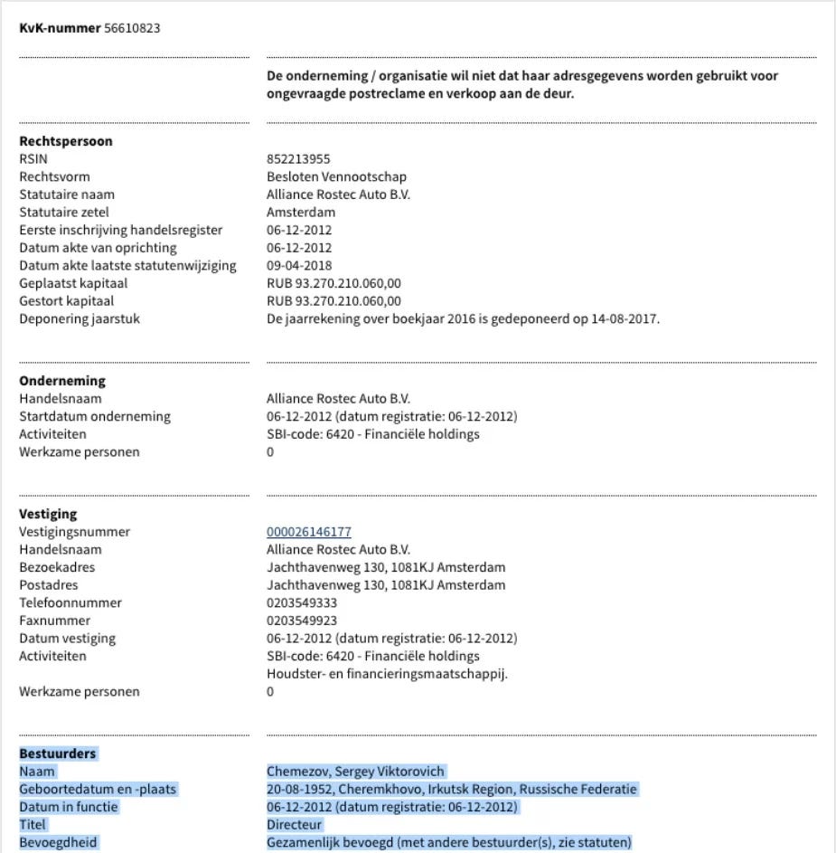 De producent van deze specifieke voertuigen is overigens de GAZ Group, een bedrijf van miljardair Oleg Deripaska. Ook hij heeft de mogelijkheid van Nederland als belastingparadijs ontdekt: op de Amsterdamse Zuidas vinden we meerdere van zijn lege constructies. In de kantoren is geen activiteit waar te nemen, er staat alleen een kamerplant. Sergey Chemezov, een van de sleutelfiguren van het regime van Poetin en verantwoordelijk voor de wapenexport van Rostec, vinden we even verderop aan de Amsterdamse Jachthavenweg 130, met Rostec Alliance. Daar is hij bestuurder in een joint venture met Renault en Nissan, waarin weer de aandelen van de Russische autofabrikant Avtovaz worden gehouden.