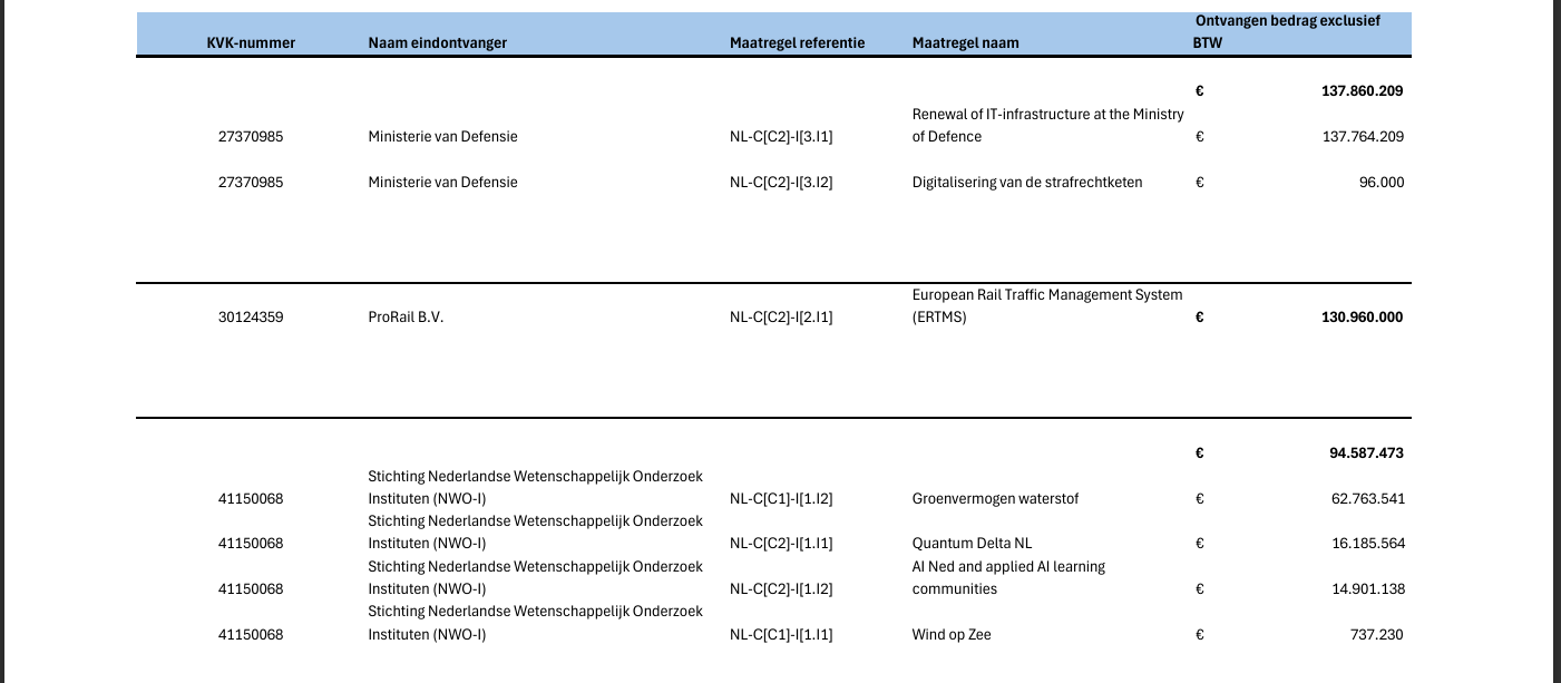 Neem de uitgaven uit het Nederlandse Coronafonds, ook wel ‘Herstel- en Veerkrachtplan’ (HVP) genoemd. Al die uitgaven worden geleend en hoe die leningen afgelost gaan worden weet niemand - maar dat laten we even. De grootste ontvanger in Nederland is het Ministerie van Defensie. Daar hadden ze wat problemen rondom IT en daarom gaat er vanaf november 2024 extra geld naar het leger om dat op te lossen, bijna 140 miljoen euro.