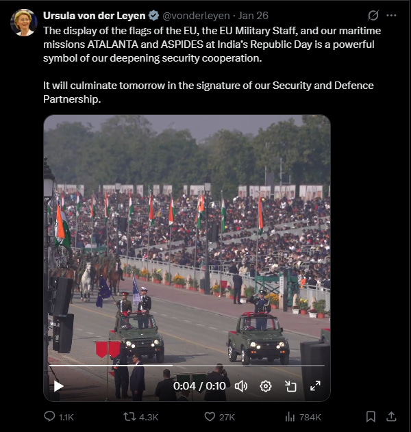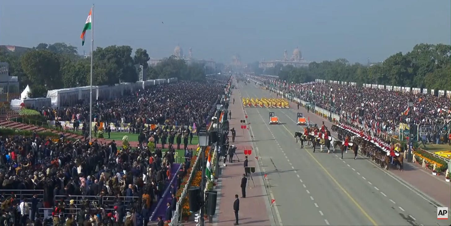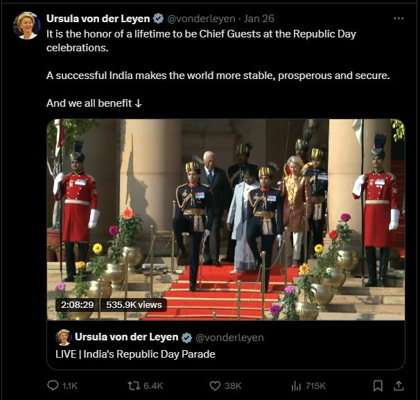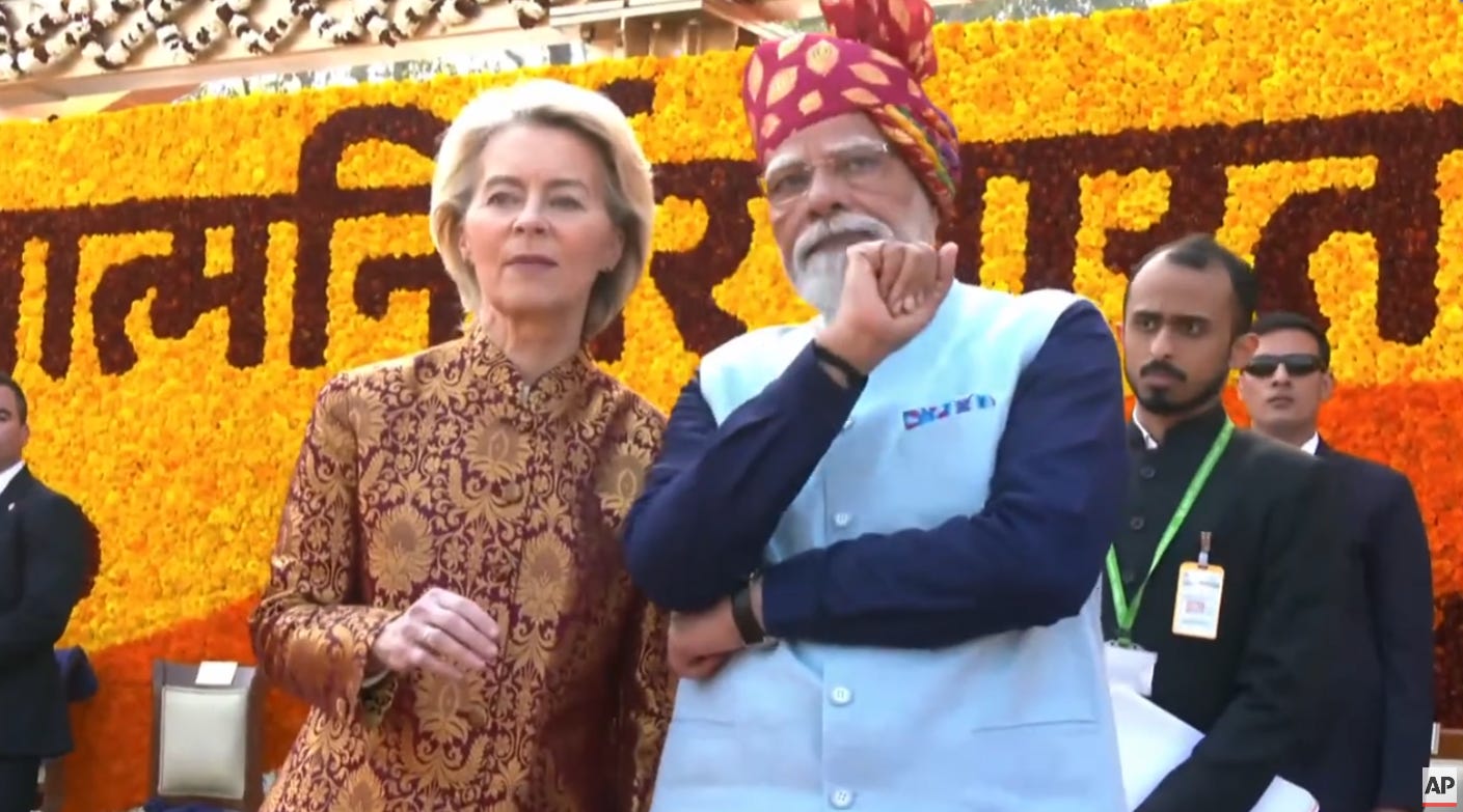 Het leek inderdaad alsof de hele parade voor het bezoek van de Duitse commissievoorzitter was opgetuigd. Dat is natuurlijk niet het geval. Ze was in New Delhi om een handelsakkoord te sluiten, precies op de dag dat de jaarlijkse ‘dag van de republiek’ werd gevierd. Die nuance zal haar natuurlijk ook niet ontgaan zijn. Over de impact van dat akkoord volgt een later artikel; we kunnen het niet allemaal achter elkaar proppen.