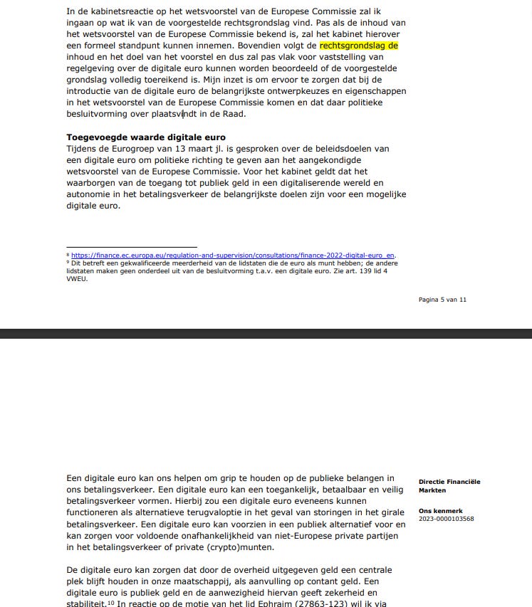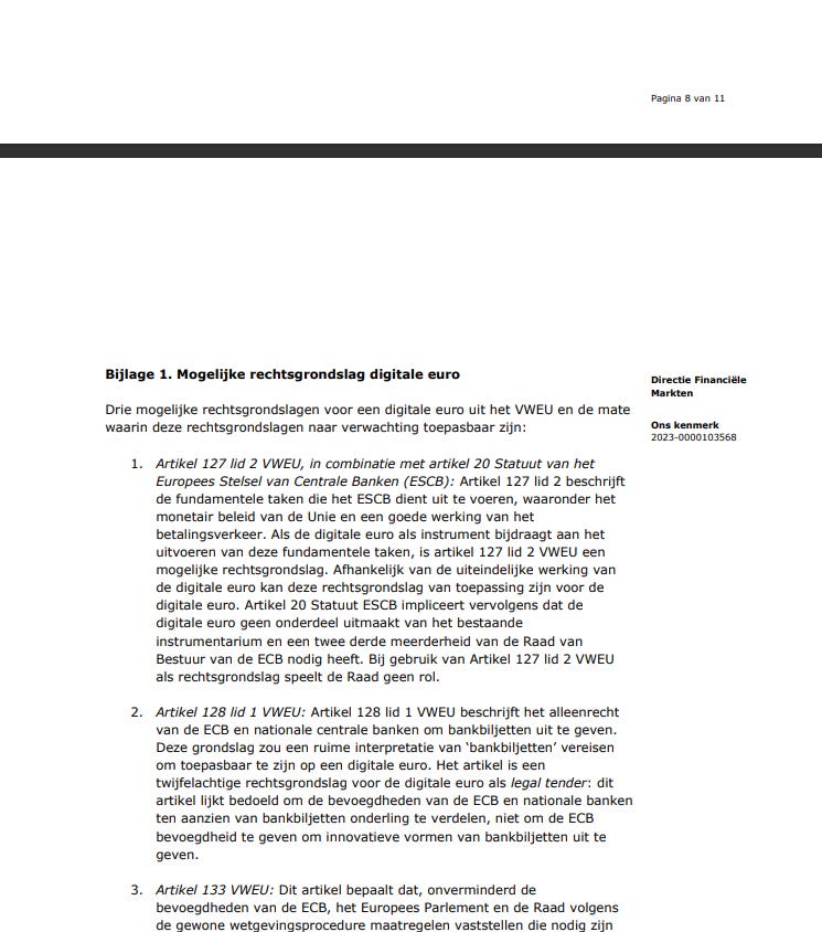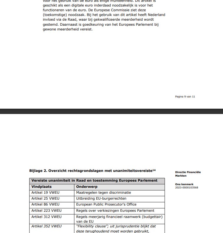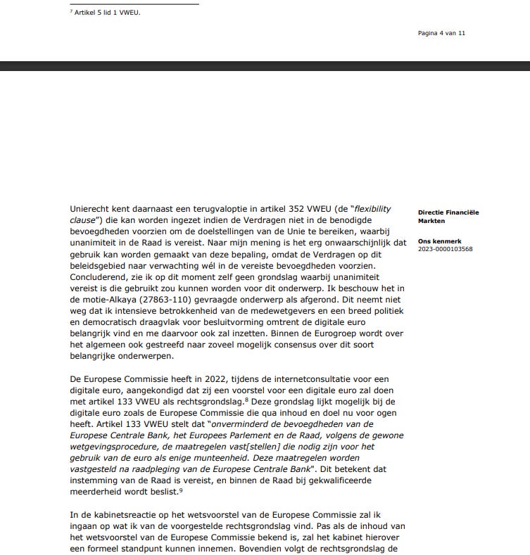 Verder noemde Kaag een lijst met rechtsgrondslagen die wel unanimiteit in de Europese raad vereisen. Daarbij is er altijd een veto bij financiële zaken. Dat is weer hoopgevend. Als de EU iets wil dat slecht is voor Nederland en het project vraagt om een bijdrage, dan is dat de manier om het te laten ontsporen. Wie de financiering van een project kan stoppen, heeft daarmee controle over het hele project, maar dan moet je wel opletten. Vaak is er geen media-aandacht voor Europese onderwerpen, het interesseert burgers ook niet en in die schaduw van de maatschappelijke aandacht kunnen projecten als CBDC tot wasdom komen. Maar het kan dus anders, op alle vlakken uit de Kaaglijst met rechtsgrondslagen die unanimiteit vereisen, heeft Nederland complete controle over het eigen lot.