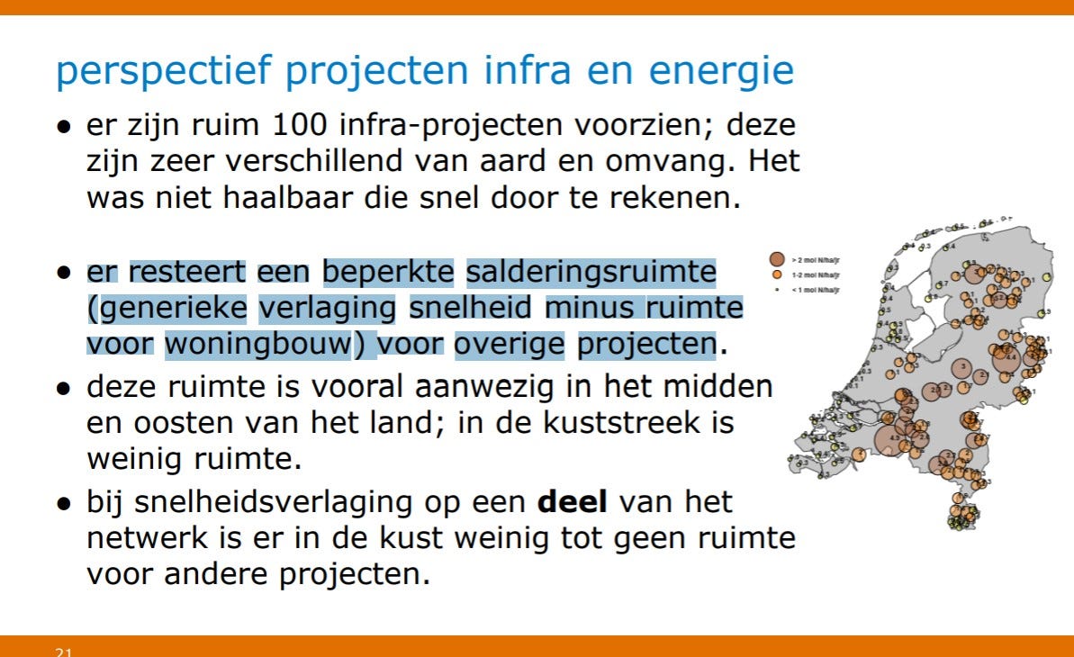 Het verlagen van de maximumsnelheid bood enkel ruimte om in 2019 nog te bouwen ('eenmalig'), in dat jaar ging het om zeventigduizend huizen. Om voor 2032 de woningvoorraad met een miljoen huizen te laten stijgen, moet de bouw vijftig procent harder werken maar daar komt een beetje stikstof(verbindingen) bij vrij. Stikstof uitstoten mag niet, dus elders moeten er op grote schaal industriële activiteiten worden afgebouwd. Dat zal een vrij rampzalige uitwerking op de economie hebben en het is ook niet mogelijk om van de ene dag op de andere allemaal bedrijven te sluiten en mensen werkloos te maken. Daarom ontstaat die ‘stikstofruimte’ er niet is, zullen er niet genoeg vergunningen afgegeven worden en stijgt de productie niet. Bij de belofte om een miljoen huizen te bouwen had ook even vermeld moeten worden dat de partijen geen enkel idee hadden hoe ze die ‘stikstofruimte’ zouden realiseren. Het was en is een loze slag in de lucht en allemaal brave mensen trapten massaal in dit vooropgezette plan om op zo’n belangrijk thema een verkiezingsbelofte te breken.