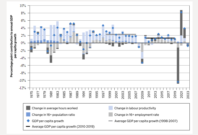 De Britse regering is voornemens de belastingen fors te verhogen, het gaat om minstens veertig miljard pond per jaar extra. Het is de bedoeling dat de economie zo weer gaat groeien. Het VK zit met het vervelende probleem dat de arbeidsproductiviteit niet meer toeneemt. Tijdens de pandemie kromp de economie wegens een dalend aantal gewerkte uren door de lockdown. Dat herstelde zich een jaar later, dus we zitten weer op het oude niveau. Dan hoop je dat de economie verder kan groeien dankzij innovatie maar dat gebeurt helemaal niet.