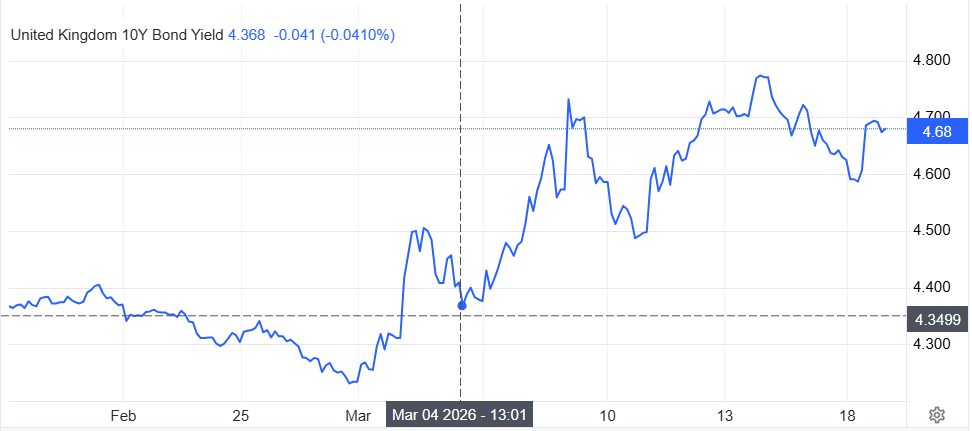 Nu leek het tot ongeveer twee weken geleden wel mee te vallen met de economische schade. Als deze oorlog een heftige economische schok teweeg brengt, dan zou je een aantal dingen mogen verwachten. Een daarvan is dat de obligatiekoersen van kwetsbare landen instorten. Het VK is zo’n land, het heeft zich uit ideologische overwegingen compleet afhankelijk gemaakt van de import van energie. Als die energie duurder wordt, dan is de kans op wanbetaling van de kant van het VK groter. Daarom dumpen beleggers de obligaties, wat betekent dat het moeilijker wordt om nieuwe leningen af te sluiten. Dat zie je terug in een hogere ‘yield’.