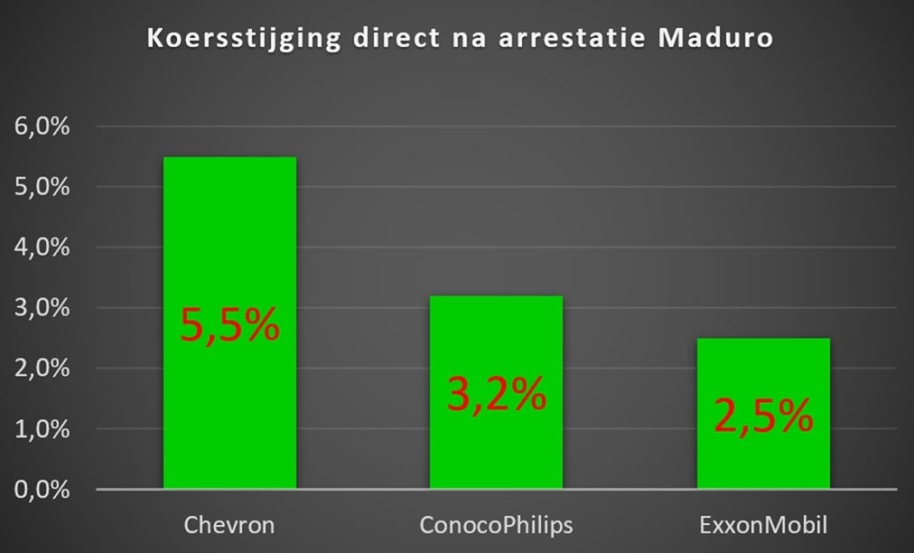 Volgens Trump heeft Venezuela van deze bedrijven ‘gestolen’ en was het daarom wachten op vergelding. Het is lastig om je voor te stellen dat dat de rationale is van een risicovolle militaire actie, zeker als er nog niet is ingezet op alternatieven als een poging het geld op andere manieren in te vorderen. Het gaat in deze om drie bedrijven: ExxonMobil, Chevron en ConocoPhillips. Enkel de eerste en de derde kunnen claimen dat Venezuela geld van ze heeft gestolen; toch ging de koers van Chevron op de dag van de arrestatie het hardst omhoog. Hoe kan dat?